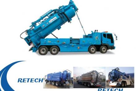 Илососная установка RETECH очищает засорившиеся канализационные трубы с помощью высоконапорного струйного насоса с одновременным всасыванием измельченного осадка и его загрузки в мусорный бак. Служит для удаления грязи из дренажных ливневых каналов и канализационных труб. Оборудование для очистки канализационных труб совмещает в себе функции вакуумного отсоса и промывки под модной струей воды.